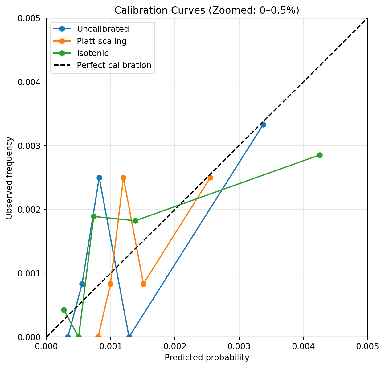 To visualise the effect of post‑hoc calibration, we compare calibration curves for the uncalibrated model and the calibrated variants. Given the rarity of the event, the plot focuses on the probability range where most predictions lie.