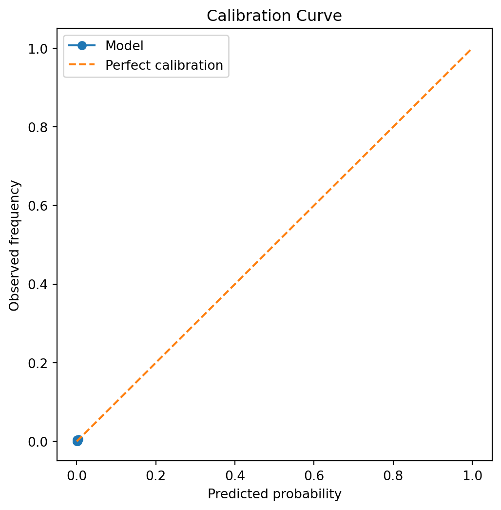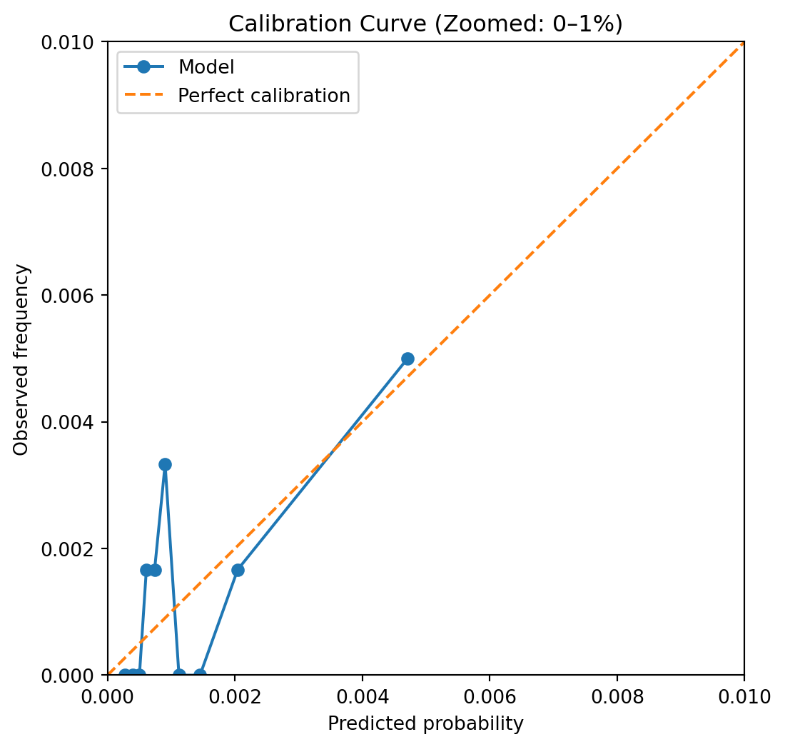 In rare‑event settings, calibration at higher predicted probabilities can be noisy due to limited sample sizes. Nevertheless, this analysis provides important insight into whether predicted risks are suitable for downstream decision‑making or require post‑hoc calibration.