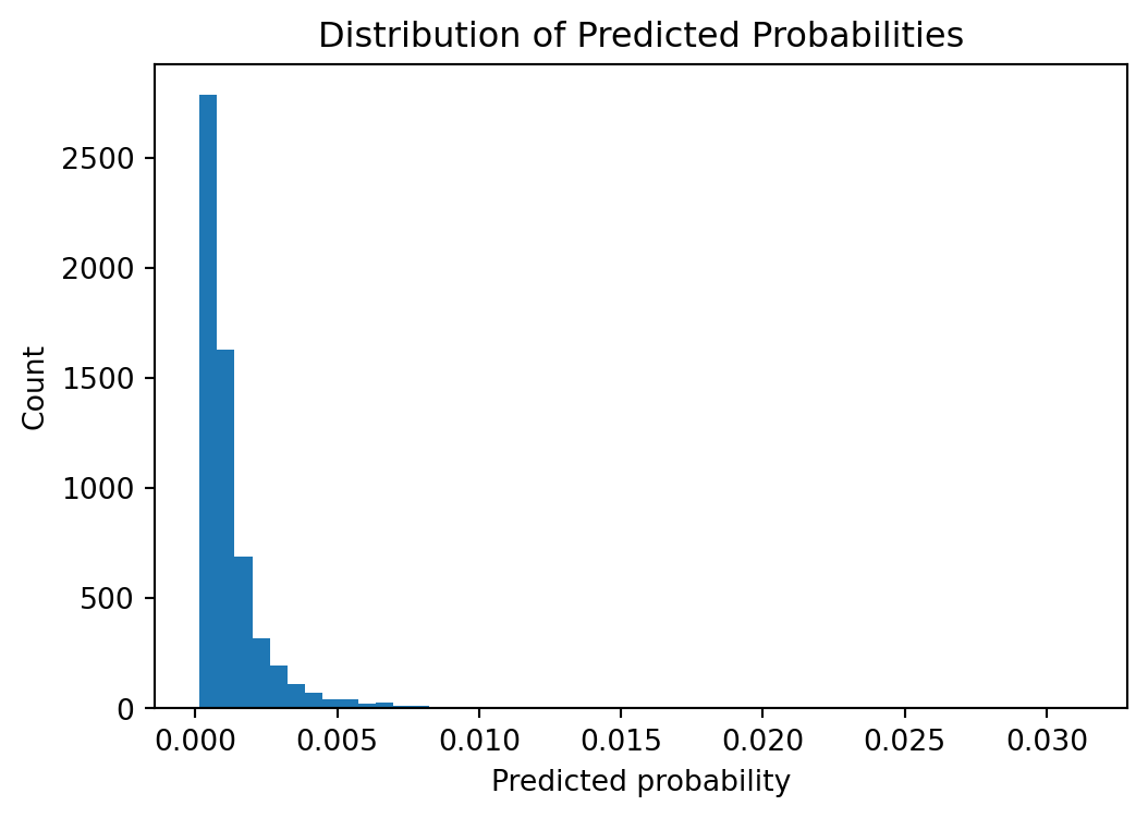 plt.figure(figsize=(6, 4))plt.hist(y_pred_proba, bins=50)plt.xlabel("Predicted probability")plt.ylabel("Count")plt.title("Distribution of Predicted Probabilities")plt.show()